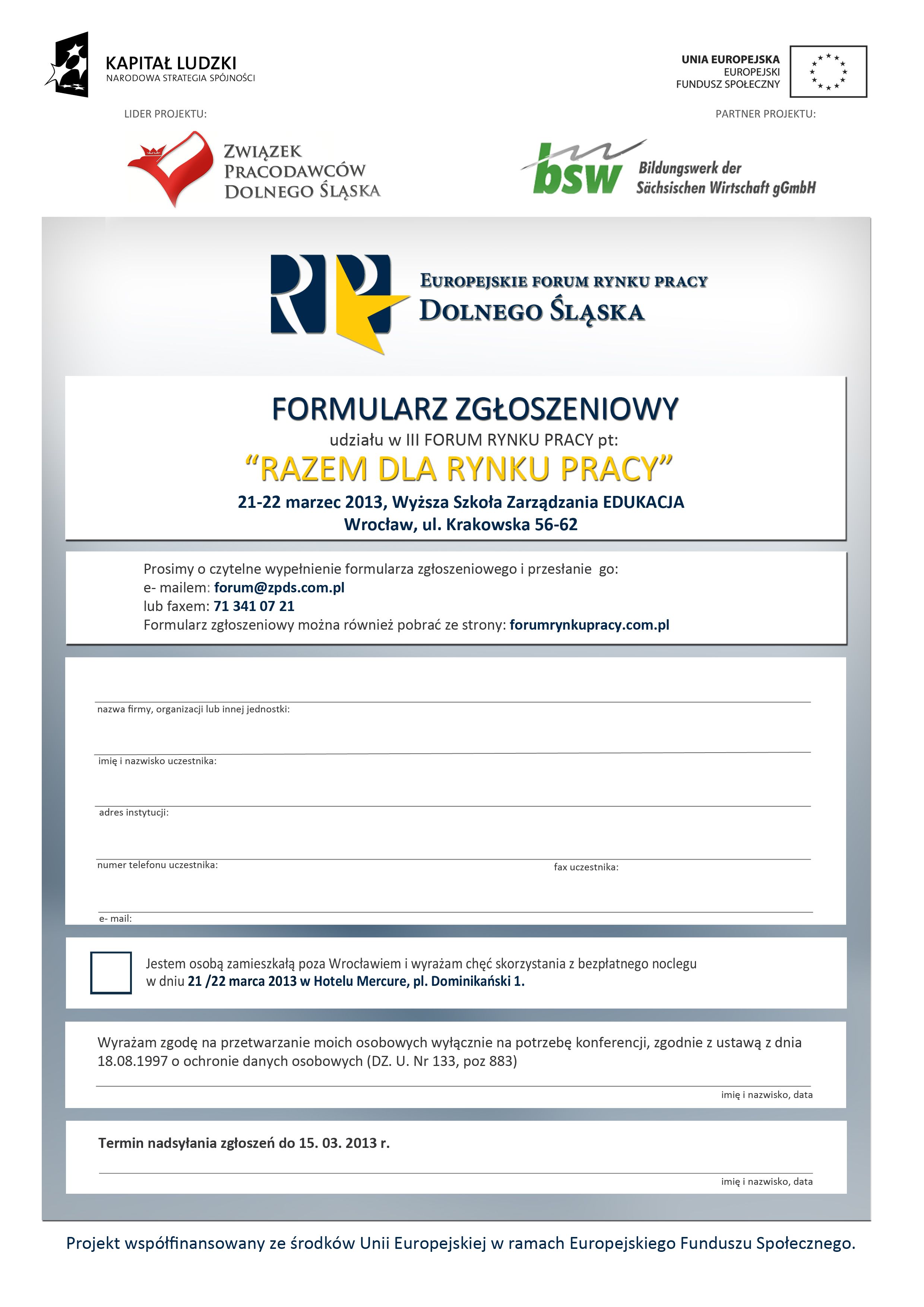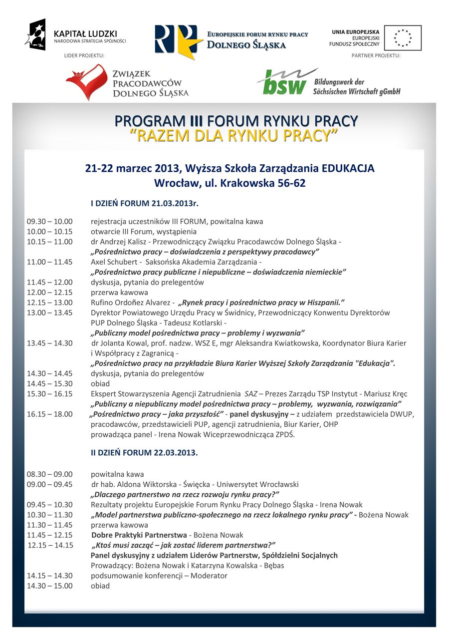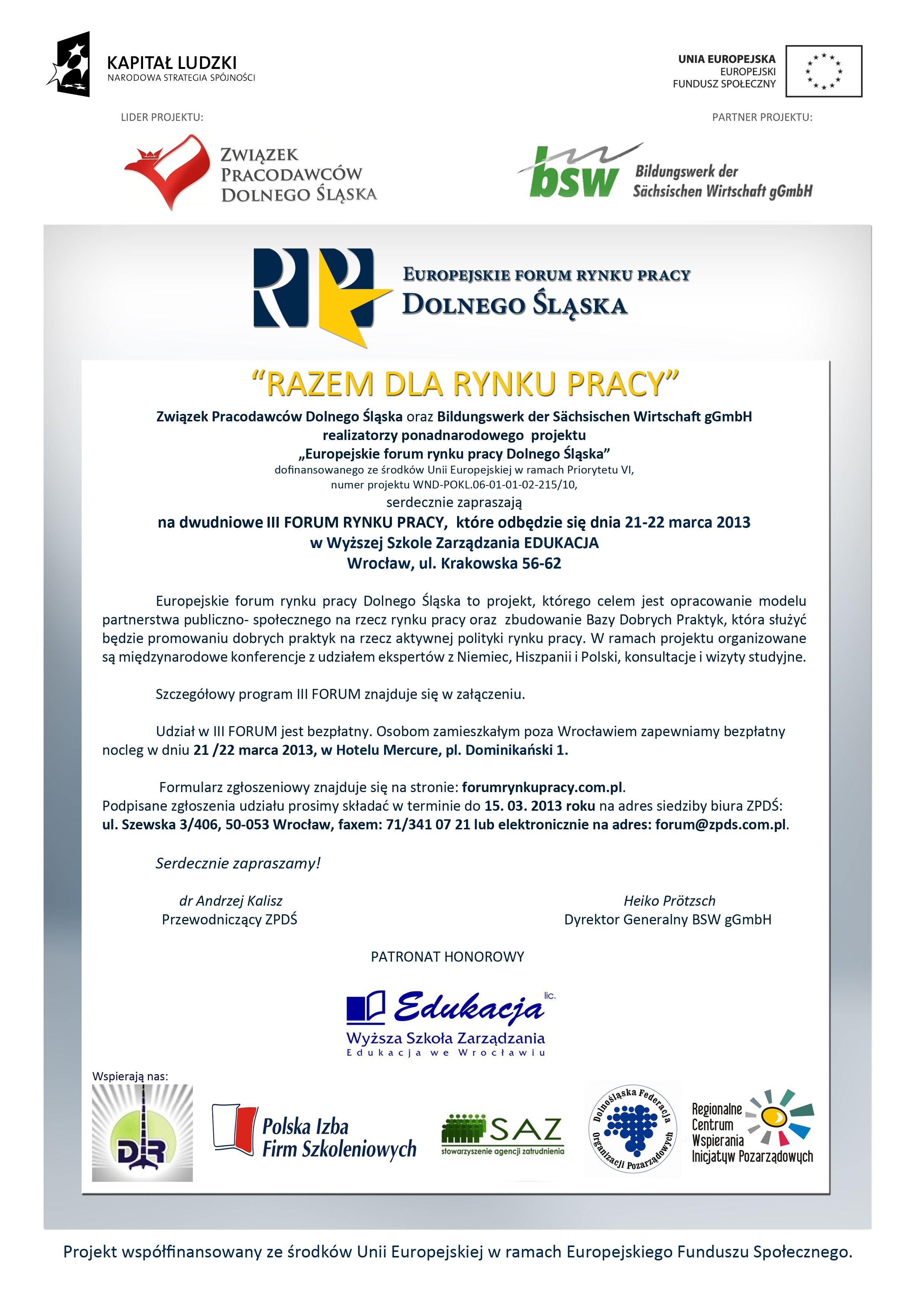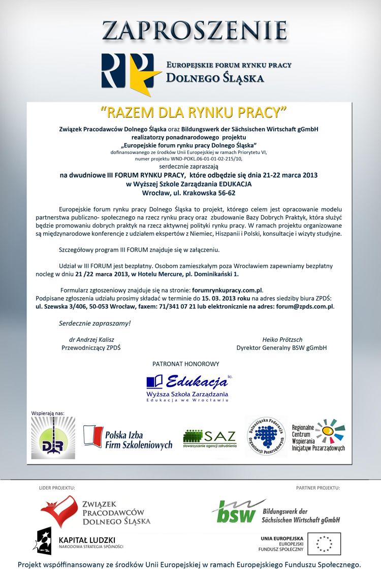 Związek Pracodawców Dolnego Śląska oraz Saksońska Akademia Zarządzania MASI realizatorzy projektu „Europejskie Forum Rynku Pracy Dolnego Śląska” serdecznie zapraszają do udziału w dwudniowym III Forum Rynku Pracy Dolnego Śląska pt: „Razem dla Rynku Pracy” które odbędzie się dnia 21-22 marca 2013 w Wyższej Szkole Zarządzania Edukacja we Wrocławiu, ul. Krakowska 56-62.